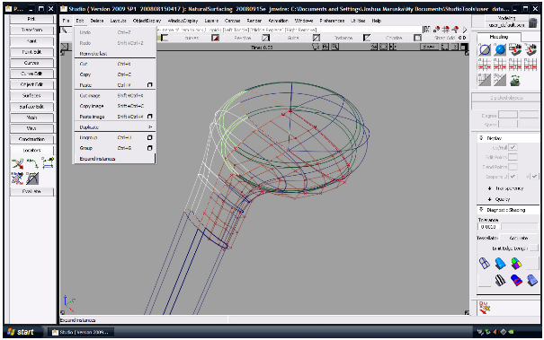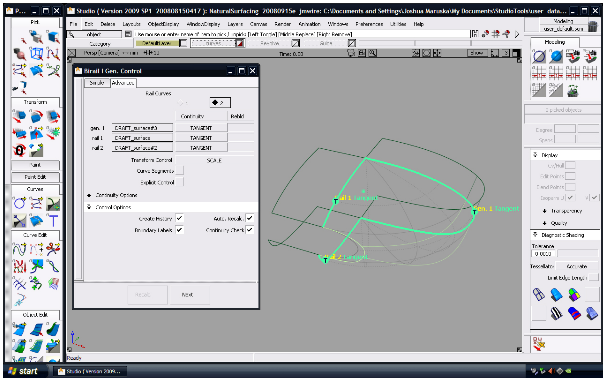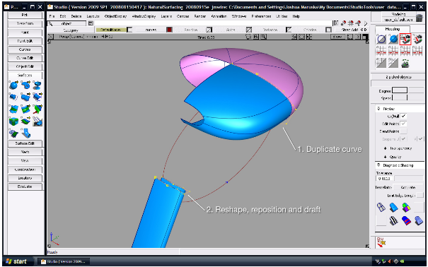 I hope this shows some of the advantages of working with this method of surface development. If this model had been constructed using several surfaces knitted together with little blends and transitions, it would have been very time consuming to make a broad sweeping change like this.