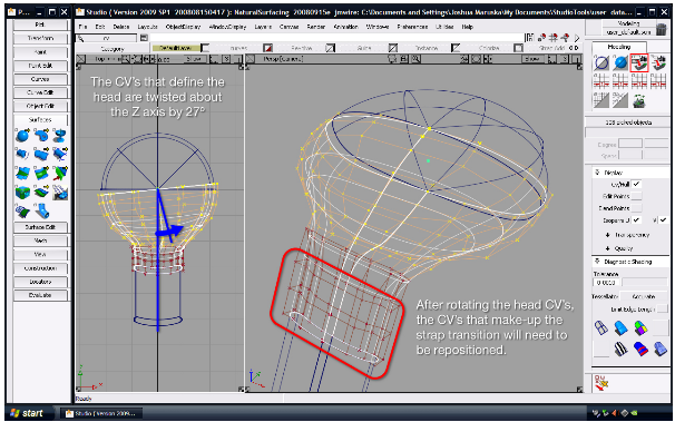 Here, I grab the CV's that make-up the majority of the watch's head and rotate them about the Z axis. In case you were wondering, the head in the final model is rotated 27 degrees. I did this by typing the values 0,0,27 after selecting the rotate tool. Be sure to be set to 'relative' mode or CV's will move in unexpected ways.