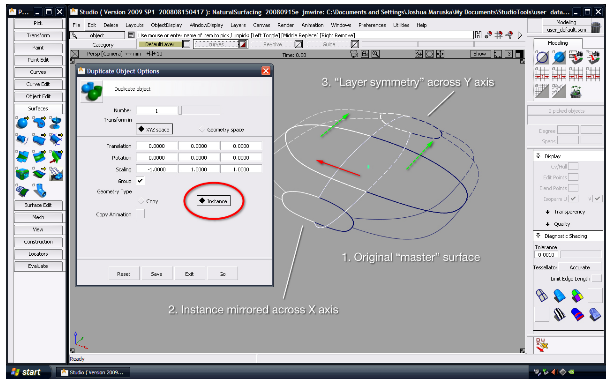 Here, I've started with my railed Master Surface and then using the Duplicate Object Options, I enter -1 in the X scale parameter (to get the mirror) and change 'Copy' to 'Instance'. An instance is like a virtual copy. You can't modify the instance, but you can modify the original from whence it came- thus aping the 'live' effect that Layer Symmetry offers.