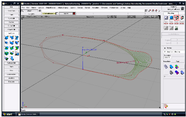 The ultimate goal, however, is for the Master Surface to hug the revolve as closely as possible. Let me note though, that while using the trimmed edge on the revolve (i.e. 2 gens and 2 rails) may have resulted in a tighter surface, building from a trimmed edge will always interject extra isoparms into the newly constructed surface. The point being is that I am trying to get the CV placement and structure in place before I worry about form. This is just the beginning...