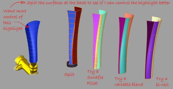 Nearly there, but I don't feel fully in control of the highlight at the back. So I switch to problem-solving mode and explore whether I should be splitting the rear surface into two, and using a fillet or blend surface.