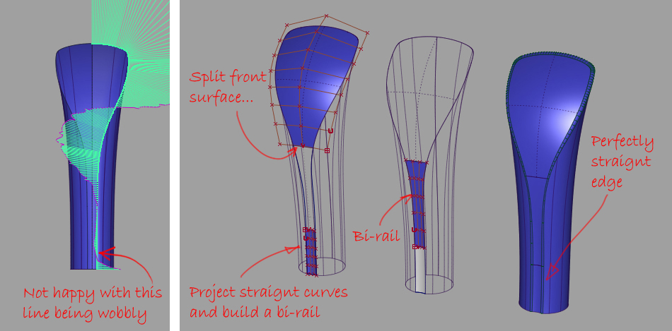 For my handle, I worked on each surface separately, using the 3D curve to trim them rather than doing an intersection. I find this easier, as I only have one thing changing at a time. If I try to get the intersection right with two surfaces, then I'm never sure which one to change.