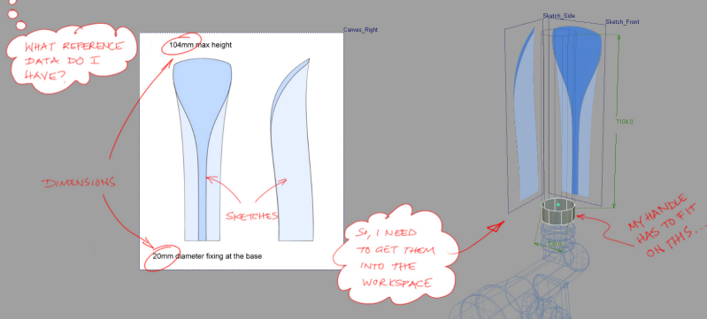 I start with the easy bits. Even if it's just an outline block, or some underlay sketches. I'm always in a bit of a panic at the start of a complex job, thinking that I may not be able to model it, and so just getting started calms me down. I also find that starting to work in 3D space on the screen seems to kick off my 3D modelling brain, and I start to see how the surfaces could come together.