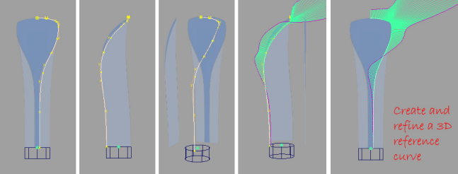 In the case of my handle, I learnt that the intersecting the two shapes gave me the design I wanted, but that it was tricky to get exactly the right intersection line just by pushing and pulling CVs. So I decided that I needed a 3D reference curve to help me get an accurate surface.