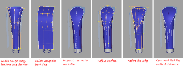 Then I start to experiment. I will work quickly and roughly, and what I am exploring is the patch layout. Its a problem-solving exercise, not really a sculpting one. All of the geometry that I create in the next few hours will probably get thrown away. And this is really important. One of the big mistakes that less experienced user make is to hang on to a piece of geometry and keep trying to make it work. Just because you've spent 3 hours trying to get a bi-rail to work, doesn't mean you should spend another 3 hours failing some more. Throw it away and try a different approach (in fact you should have done that 2 hours ago).