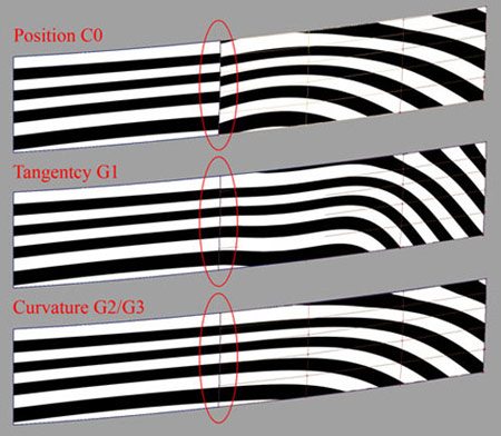 Tangent continuity between surfaces describe a basic quality of the appearance of a highlight across the surface boundary.