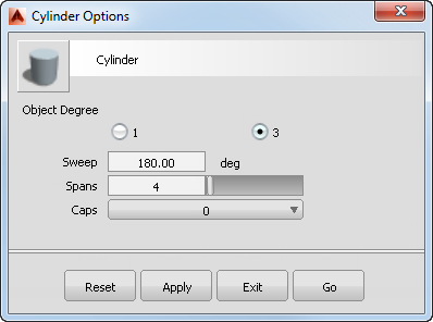- Set the Sweep to 180 and the Spans to 4 to create a half cylinder. Set the Caps to 0 from the drop-down menu, to create only the side wall of the cylinder.