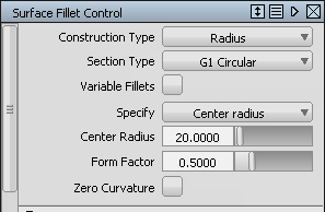(if you are using Alias Design, select Surfaces > Surface Fillet). Double-click the icon to open the option box. Change Construction Type to Radius and Center Radius to 20.