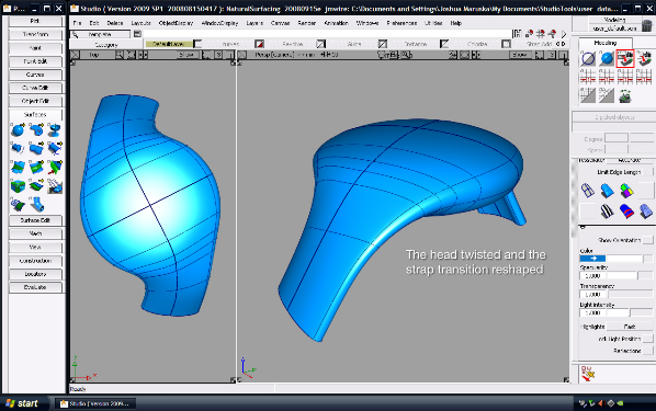 The symmetrical version was modeled with a head piece and two strap extensions that splayed outward in a linear fashion at 30 degrees. These linear extensions are the right way to model a strap that will be manufactured, but they don't help the designer visualize how the product will look in context - on the wrist. Here are the steps I used to create a version of the design with a formed strap.