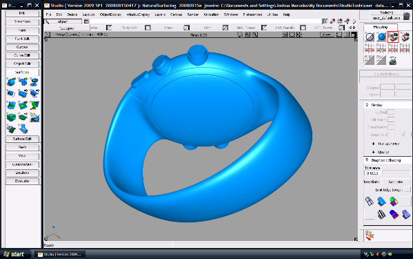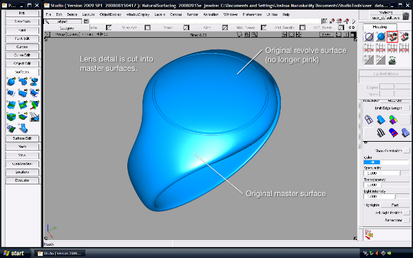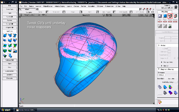 In the first part of this surfacing demo, I showed techniques for setting-up surfaces with some forethought toward CV placement, creating a work environment suitable for Four-way Symmetrical modeling, the use of reference surfaces to guide the sculpting of a form and a general approach to moving CV's to refine a shape or to make drastic changes.