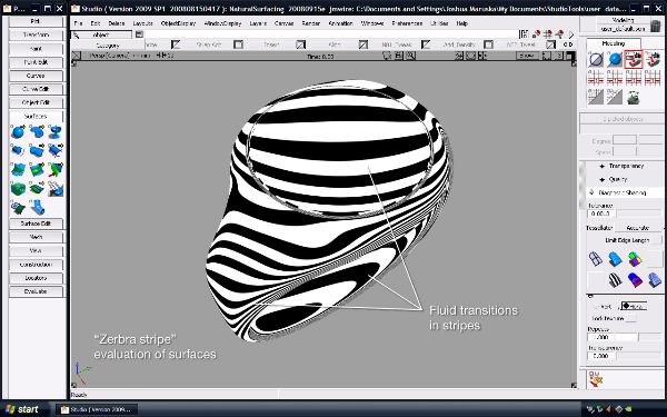 Depending on your license of Alias Studio, you'll have different diagnostic shaders to evaluate your surfaces with. The zebra stripe is pretty common and I use it quite a bit. I find that I have to use a fairly high tolerance setting on the tessellation to get pleasing visual results though. This session is set to "0.001" tolerance and the "accurate" tessellator.