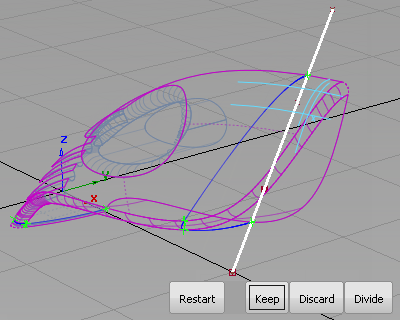 The Trim tool can be used to create a curve-on-surface directly from a projected curve before trimming the surface. Now use the curve you have drawn to cut away the front end of the surfaces.