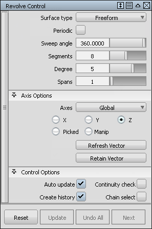 In the Axes Options section, select Global for the Axes. Global axes enable you to revolve all the curves at the same time around the origin.