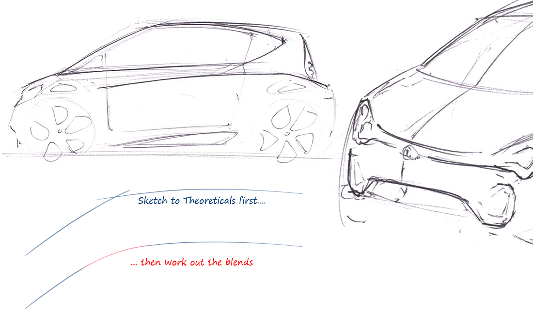 Working to theoreticals is a natural part of the sketching process. We do it to get a strong, taut line. If we tried to draw the main shapes and blends in one pencil stroke, the line would be less confident and have less tension. The same principle applies to building Alias curves and surfaces.