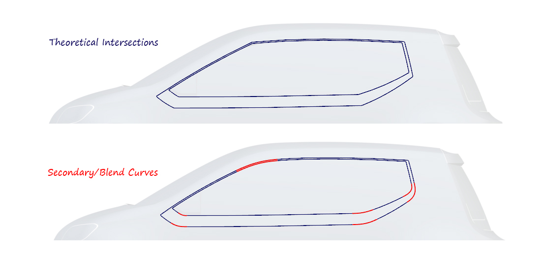 This example shows the outline curves for the side windows. They were first created to the 'theoretical' intersections, before the transitions were applied for the final design.