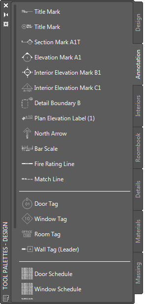Custom palettes created by your CAD manager or other users may also contain elevation label tools with multi-view block definitions and properties that are customized for your projects or office standards.