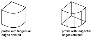 Determines whether tangential edges are displayed. A tangential edge is the transition line between two tangent faces. It's the imaginary edge at which two faces meet and are tangent. For example, if you fillet the edge of a box, tangential edges are created where the cylindrical face of the fillet blends into the planar faces of the box. Tangential edges are not shown for most drafting applications.