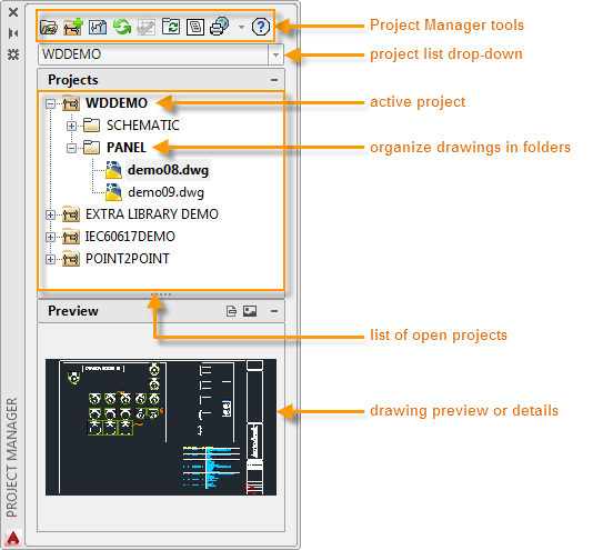 AutoCAD Electrical is project-based. A project is a set of interrelated drawings. All project-related information, including the drawings included in the project, is saved in a project file with a .wdp extension.