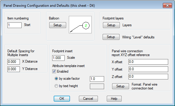 When inserting a nameplate you can associate it to a panel footprint. Values from the footprint, such as Tag, installation, location, and descriptions, are copied from the footprint. However, you can assign an item number and catalog value specific for the nameplate.