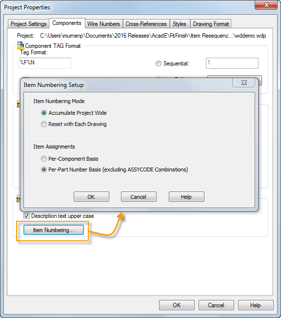 There are a couple of project properties that affect item numbering. Make sure you set these properties according to your preferences before resequencing the item numbers.