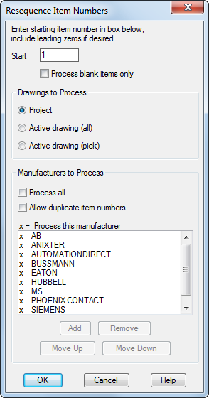 Item numbers can be assigned to both panel and schematic symbols. When you assign a catalog value to a component, the program checks if an item number is assigned to this catalog value on another component. If it is, the item number is assigned automatically. If the item number is not assigned automatically, you can assign it when you edit the component. You can also assign them project wide with the Resequence Item Numbers command. Find