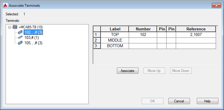 • Terminal Strip tab: Modify the terminal block properties, spare terminals, accessories, multi-level terminals, and destination locations.