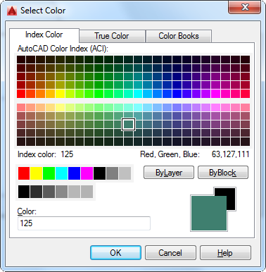 You can select from the 255 AutoCAD Color Index (ACI) colors, true colors, and Color Book colors, available on three tabs.
