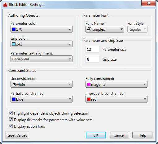 Modifies color, text, grip, constraint, and other display settings for the Block Editor.