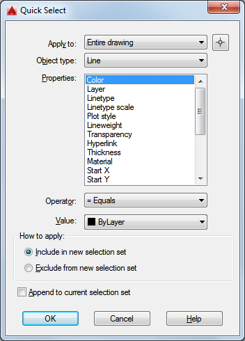 If Append to Current Selection Set is selected, the filtering criteria is applied to the entire drawing.