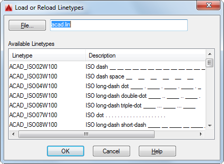 Displays the name of the current LIN file. You can enter the name of another LIN file or click the File button to select a file from the Select Linetype File dialog box.