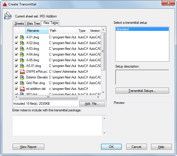 By default, all files associated with the current drawing (such as related xrefs, plot styles, and fonts) are listed. You can add files to the transmittal package or remove existing files. Related files that are referenced by URLs are not included in the transmittal package.