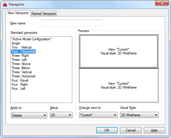 Specifies either a 2D or a 3D setup. When you select 2D, the new viewport configuration is initially created with the current view in all of the viewports. When you select 3D, a set of standard orthogonal 3D views is applied to the viewports in the configuration.