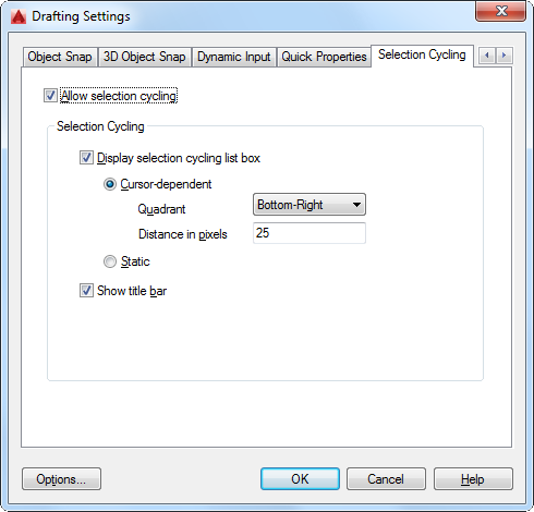 Selection cycling allows you to select objects that are overlapping by pressing Shift + Spacebar. You can control whether a blue cursor icon displays to indicate overlapping objects and you can configure the display settings of the Selection list box.