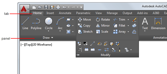 The ribbon is composed of a series of tabs, which are organized into panels that contain many of the tools and controls available in toolbars.