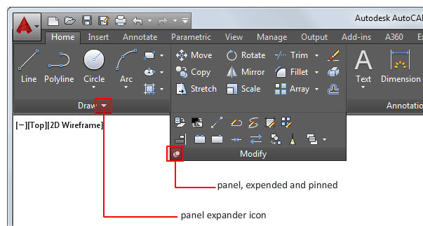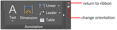 You can pull a panel off a ribbon tab and into the drawing area or onto another monitor. The floating panel remains open until you return it to the ribbon, even if you switch ribbon tabs.