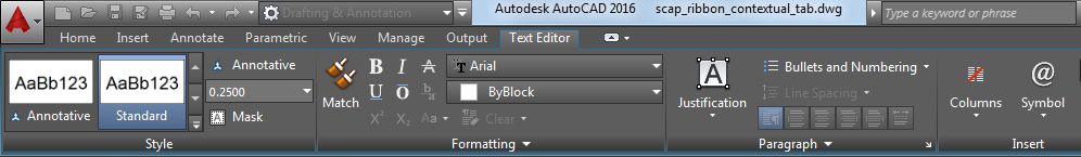 When you select a certain type of object or start certain commands, a contextual ribbon tab is displayed instead of a toolbar or dialog box. The contextual tab closes when you end the command.