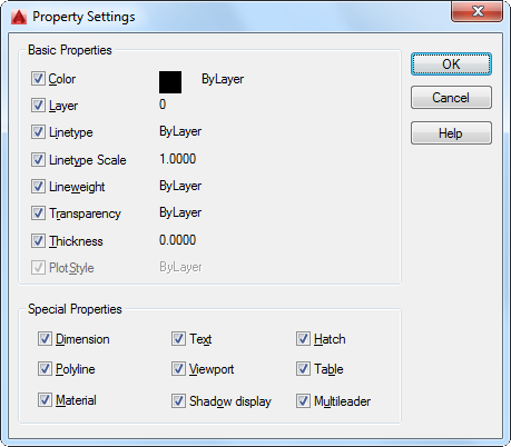 In addition to basic object properties, changes the hatch properties (including its annotative properties) of the destination object to that of the source object. To match the hatch origin, use Inherit Properties in HATCH or HATCHEDIT. Available only for hatch objects.