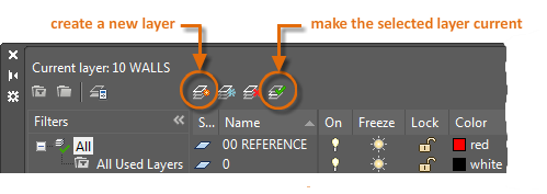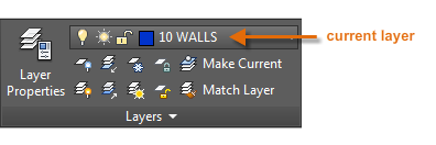 As indicated, layer 10 WALLS is the current layer. All new objects are automatically placed on that layer. In the list of layers, the green check next to layer 10 WALLS confirms that it is the current layer.