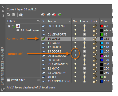 In the column labeled On, notice that the light bulb icons for two layers are dark. These layers were turned off to hide the doors and electrical wiring in the floor plan.