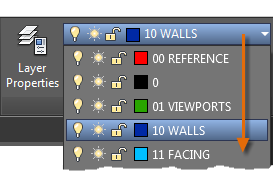 Occasionally, check to make sure that the objects you create will be on the correct layer. It's easy to forget to do this, but it's also easy to set. Click the drop-down arrow to display a list of layers, and then click a layer on the list to make it the current layer. You can also click on any icon in the list to change its setting.