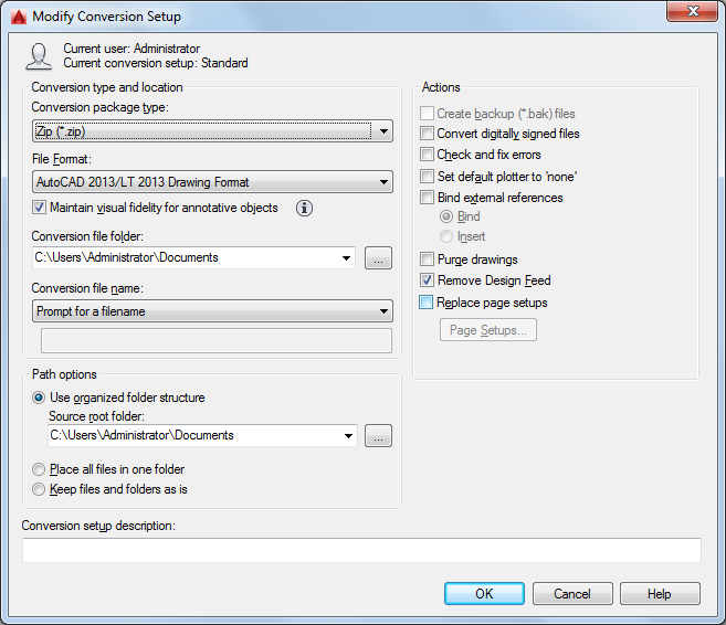 Enter a description for the conversion setup. This description is displayed in the DWG Convert dialog box and the Conversion Setups dialog box below the list of conversion file setups. You can select any conversion setup in the list to display its description.