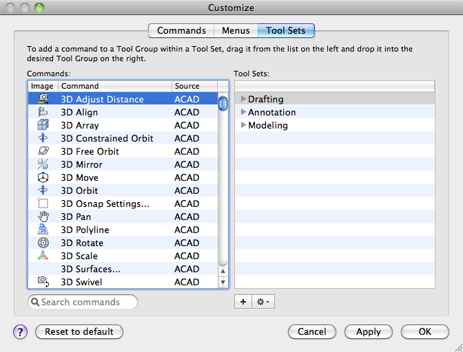 Lists the tool sets available on the Tool Sets palette. Expand a tool set to see the commands, tool groups, and drop-downs (also known as flyouts) that are assigned to the tool set.