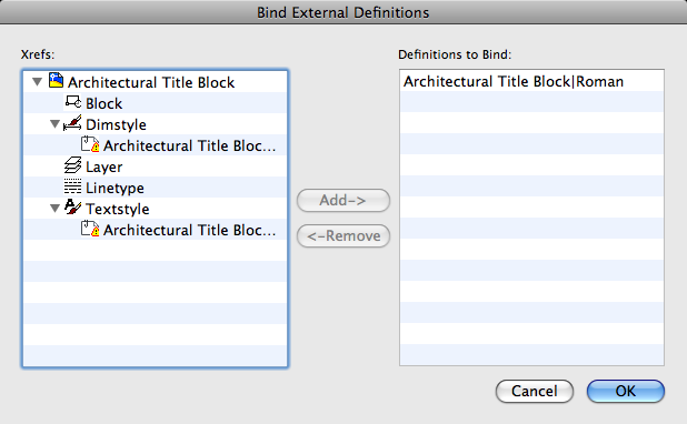 Moves the named object definitions selected in the Xrefs list into the Definitions to Bind list.