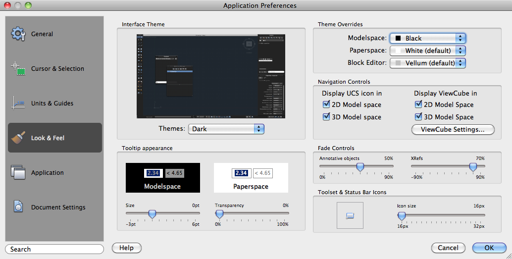 Controls which theme to apply to elements such as the status bar, palettes, and the drawing windows. You can choose from a Dark or Light theme.