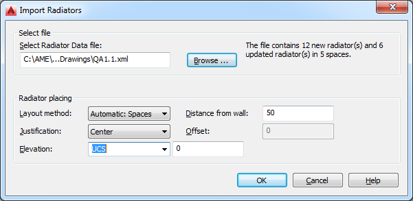 You can add radiators to a drawing using data from an XML file produced by a heating calculation program such as SOLAR COMPUTER Desktop. The XML file contains an identifier for one or more of the spaces in the model. Each space identifier in the file precedes a list of the radiators to be placed into the space.
