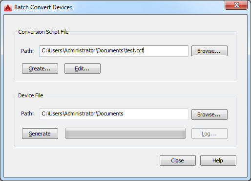2. In the Batch Convert Devices dialog box, under Conversion Script File, for Path specify the device conversion script (CCF file) to use to convert the blocks to device styles.