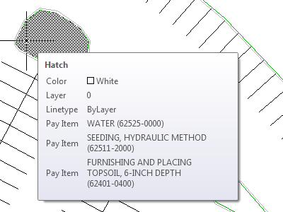 The tooltip displays the pay item description and ID that has been assigned to that object.