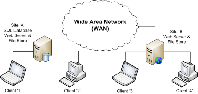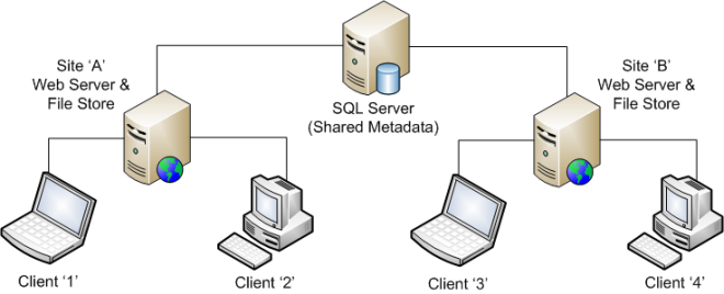 The second method is to set up a main site with the database and main file store located on the same server. The main site has the most users and is where the most design work is done.