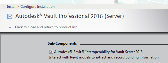 The Revit Interoperability add-in is installed during the Vault Server installation. You must customize the Vault Server options to include Revit interoperability on the Configure Installation screen.