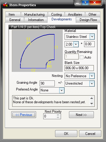 When nesting on grained material, such as Stainless Steel, it is often a requirement to keep the grain running in the same direction through each development of a part. This can be achieved by use of the graining angle setting. The Graining Angle can be set up on any part, whether a pattern or Cad part. However, if it is to be used by default on a pattern, it must be a set up as a catalog part. If the Graining Angle is set up in a catalog part that is still in the item folders, then the option will be active each time the part is selected. Alternatively if a pattern or Cad part that has not had its graining angle set has been added to the Job Contents screen, it can be set there.